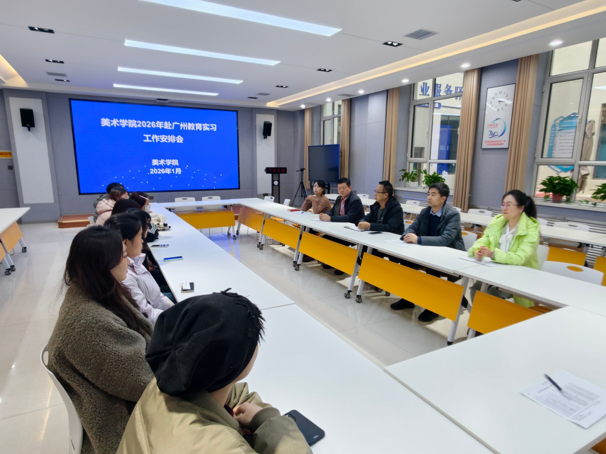 1月6日,美术学院召开了2026年赴广东教育实习工作安排会,学院领导班子、实习班级班主任教师代表及十余名赴广东教育实习同学参加了会议。